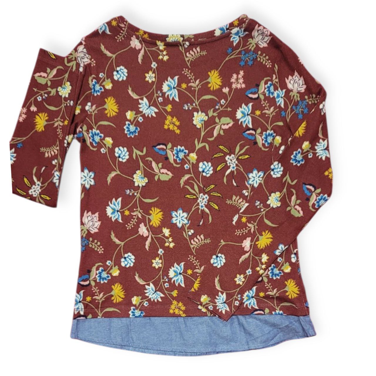 Blusa Springfield manga larga en color rojo vino, con estampado floral multicolor. Perfecta para looks casuales con un toque elegante. 🌸🍷