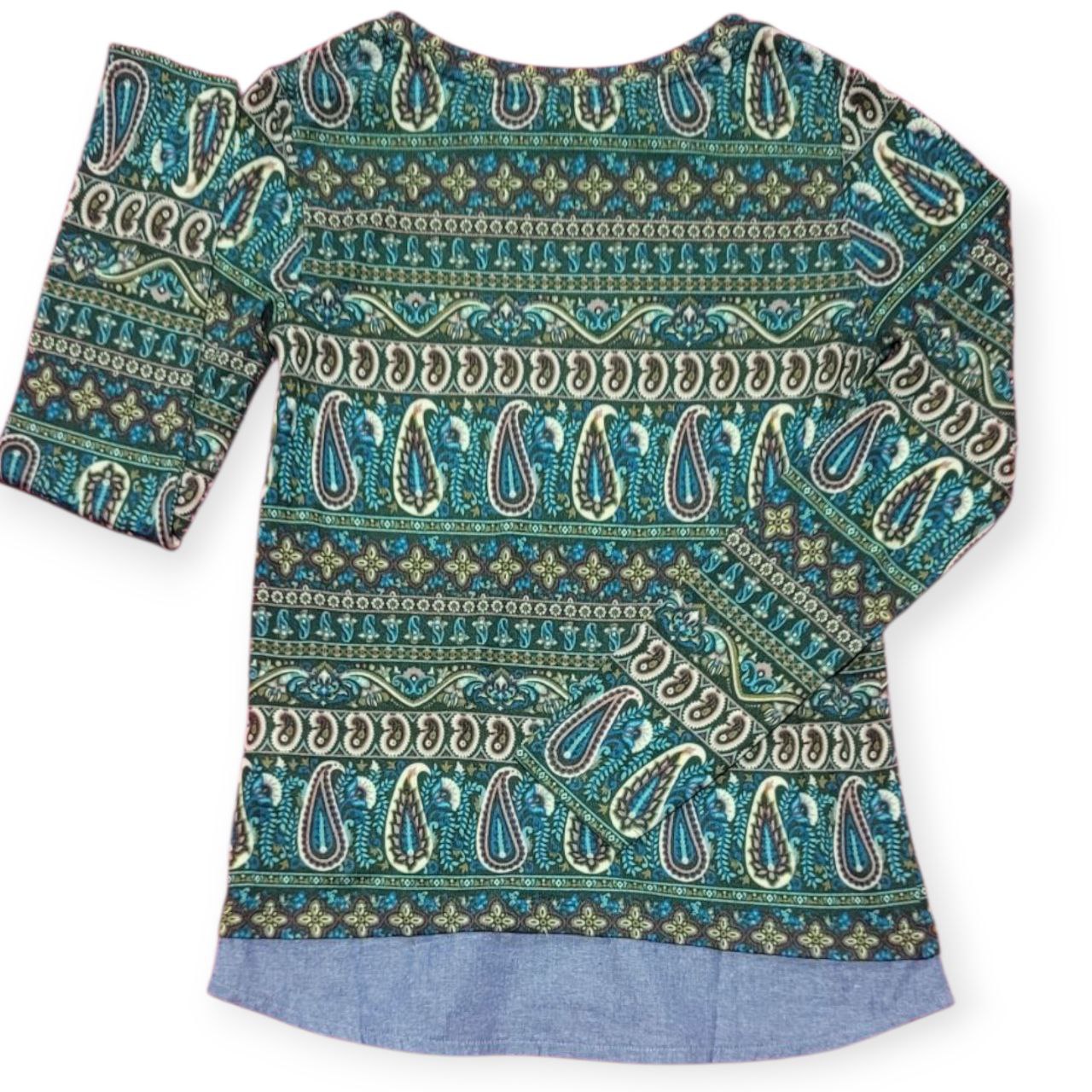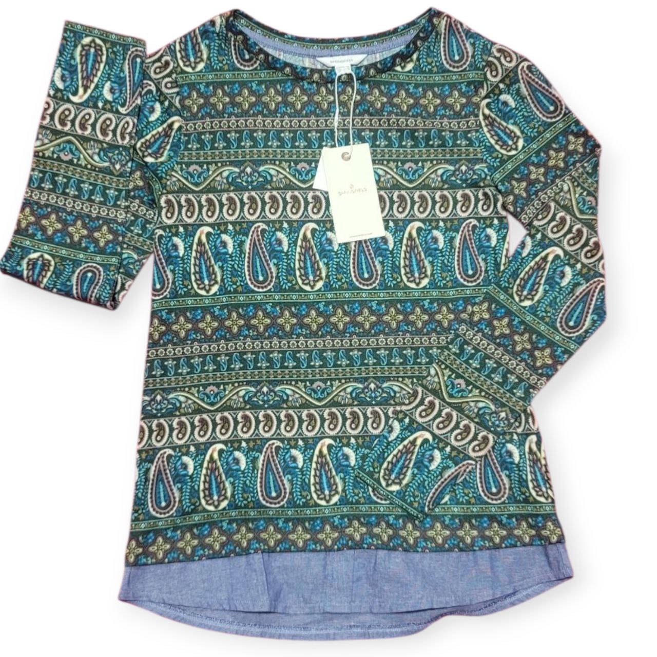 Blusa Springfield manga larga con estampado paisley en tonos verdes y azulados. Comodidad y estilo bohemio para tus outfits casuales. 🌿💙